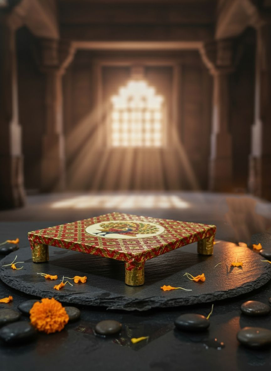 Bring divine energy and traditional beauty into your home with this exquisitely handcrafted Mata Ki Chowki. Designed with intricate artistry and devotion, this chowki serves as a perfect base for placing idols, Kalash, or performing Mata Ki Chowki ceremonies, Navratri puja, and other auspicious rituals.