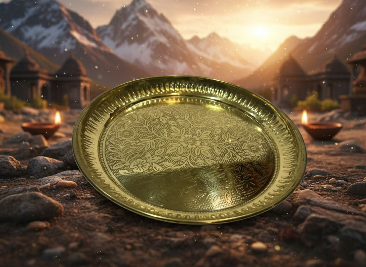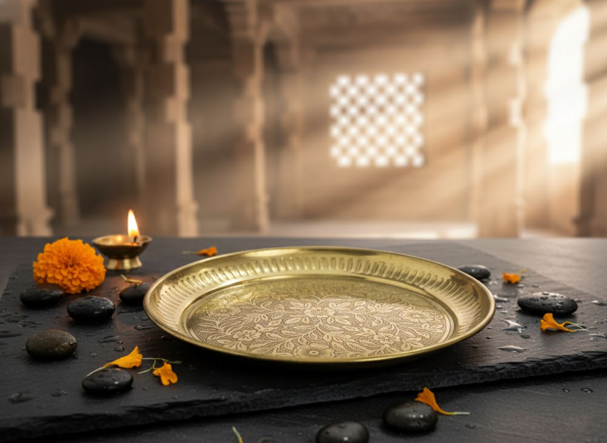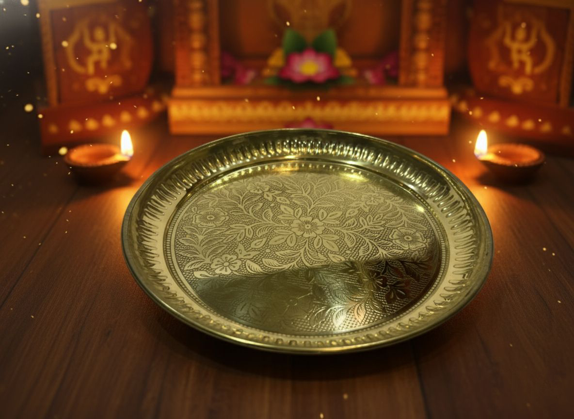 Compact and elegant, this thali is ideal for holding essential items like diya, incense sticks, roli, chawal, and flowers during worship. The sturdy brass construction ensures long-lasting durability, while its classic design adds a sacred touch to your temple decor.